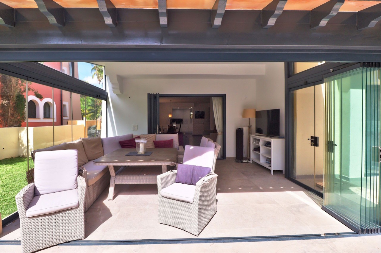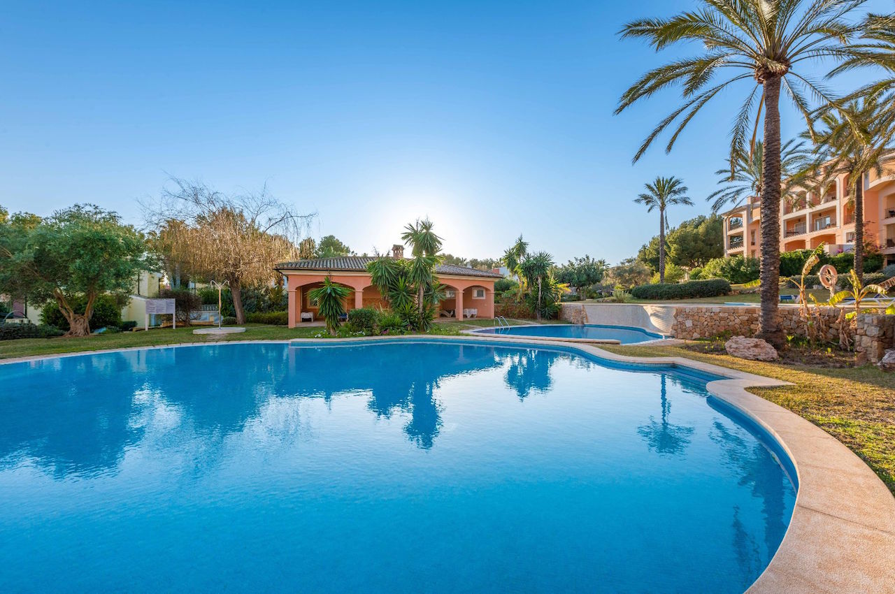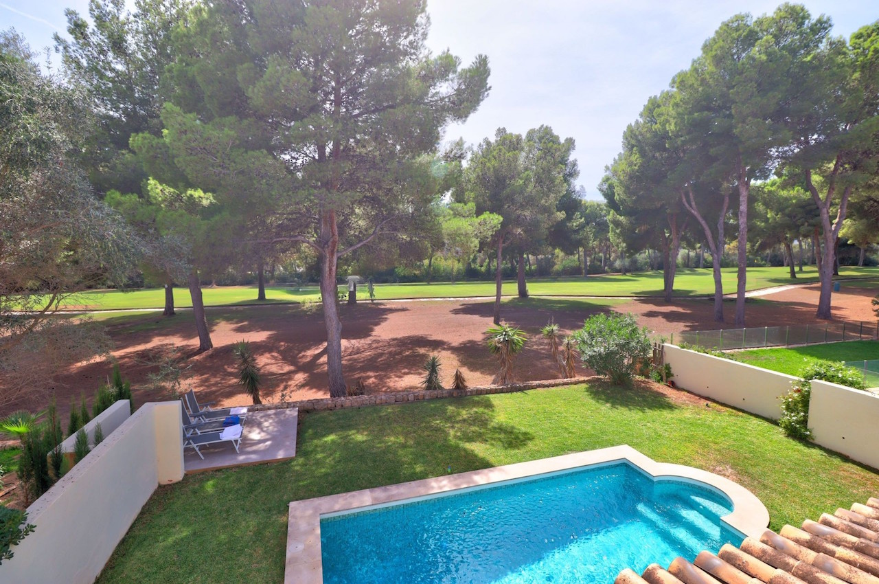 This stunning villa for sale in Santa Ponsa offers approximately 195 m² of elegant living space on a 700 m² plot, perfectly combining comfort and style. Located directly on the prestigious golf course of Ses Penyes Rotges, this villa for sale in Santa Ponsa provides the ideal setting for golf enthusiasts and families seeking privacy. The property features a spacious living and dining area with an integrated kitchen, opening onto a 21 m² covered terrace that can also be used as a winter garden with elegant glazing. The villa offers four bedrooms, three with en-suite bathrooms, and a guest toilet. Two bedrooms are on the ground floor, one of which opens directly to the landscaped garden and private swimming pool. Every detail of this villa for sale in Santa Ponsa reflects high-quality construction and a modern yet timeless design.