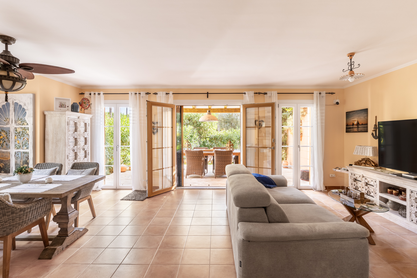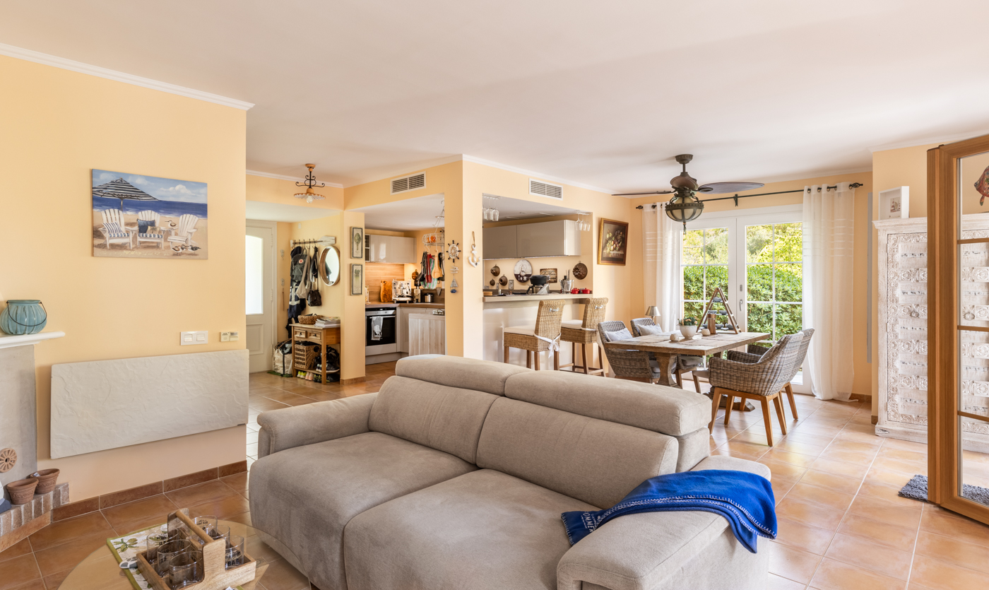 This townhouse for sale in Santa Ponsa, Mallorca has many desirable features: a fully equipped kitchen, built-in wardrobes, double-glazed PVC windows with wooden shutters, tiled flooring and warm/cold air conditioning, a fireplace, renovated bathrooms, an over-covered terrace and a private portion of garden. In addition it offers communal gardens, a communal swimming pool, underground parking, monthly community costs of about €300 including garden maintenance, and comes unfurnished to allow personalization. These amenities ensure that this townhouse for sale in Santa Ponsa, Mallorca provides both comfort and luxury in an excellent setting.